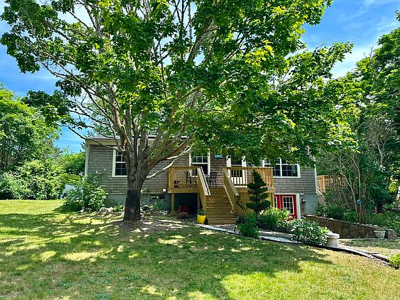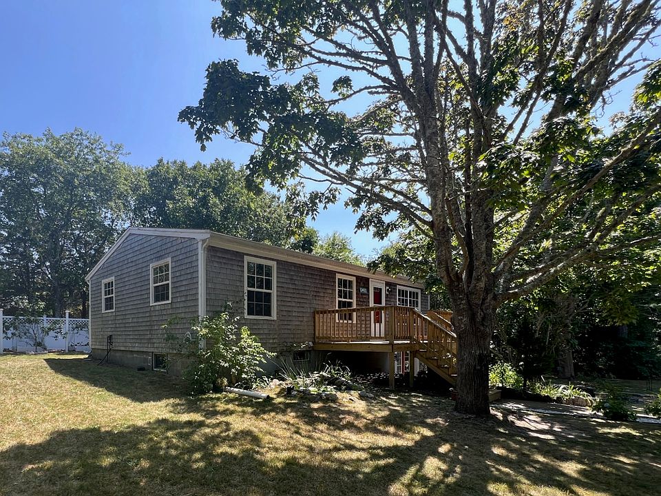 This ranch style 3 bedroom home centrally located in a quiet neighborhood is close to the bike path with easy access to town and beaches. Sited on a 12,000 square foot parcel with a spacious privately enclosed yard and mature gardens. First floor includes an efficient galley kitchen with a quaint dining area. The living room leads out to a cozy front porch. There is also a spacious side deck that sits off the kitchen for outdoor living. The lower level offers a walk out heated basement with plenty of light, partially finished with a full bathroom. There is a newly installed heat pump system for heat and A/C as well as leased solar panels.