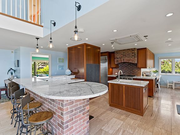 The open kitchen at Waialua Beachfront Estate has extensive counter space, two sinks, high-quality stainless steel appliances, and bar seating, making it easy to enjoy meals at home. A dining space with a gas fireplace and a wall of custom pocket doors flows out to an open-air dining area, or into a comfortable living space with plenty of seating and a sizable television. Downstairs, another common area provides an additional sectional sofa and television, as well as a ping pong table. Amenities such as wireless internet, cable, a DVD player and DVD library, a stereo, a washer and dryer, and a dedicated kids' playroom ensure total guest comfort throughout your stay.
