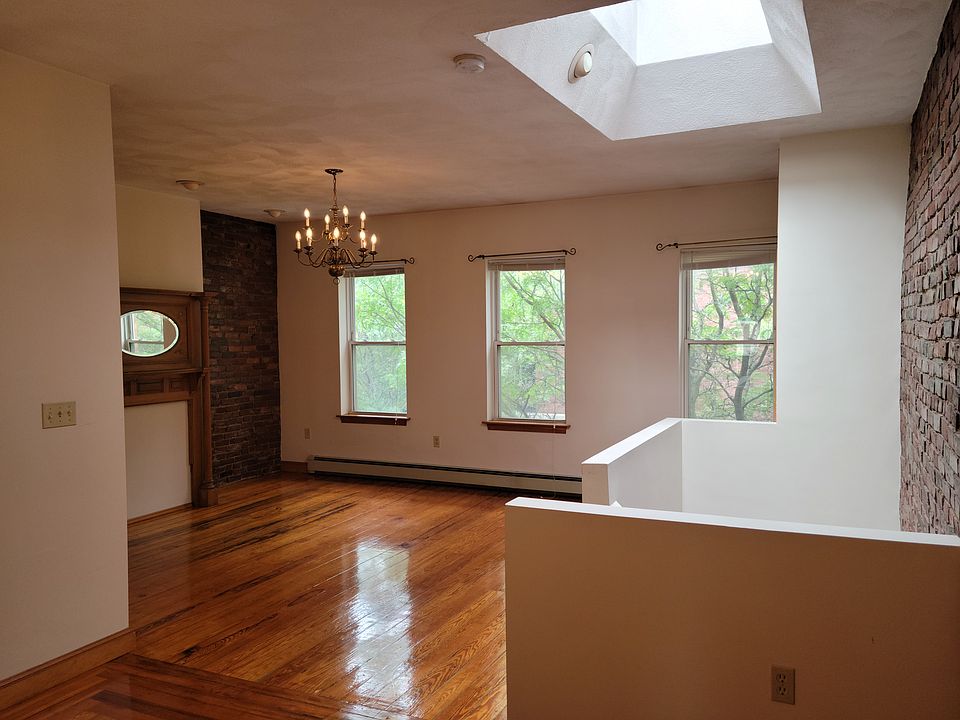 No pets, Non Smoking, Max 2 adults. Located on the Gas Lit side of Baldwin st, between the Armory and Bunkerhill School condos. Sky line view out the kitchen's brick arched window. One of the nicest streets in town. More living space than most. Parking on both sides of Baldwin st, so plenty of air and light reaches inside the apartments open floor plan living area front to back. A 5 foot skylight lights the living area from above. Bright and sunny throughout the house, Brick in every room. Gas lit street, away from the bars, close to the T. Top floor of a 3 family brick building -only 3 other neighbors in the building.