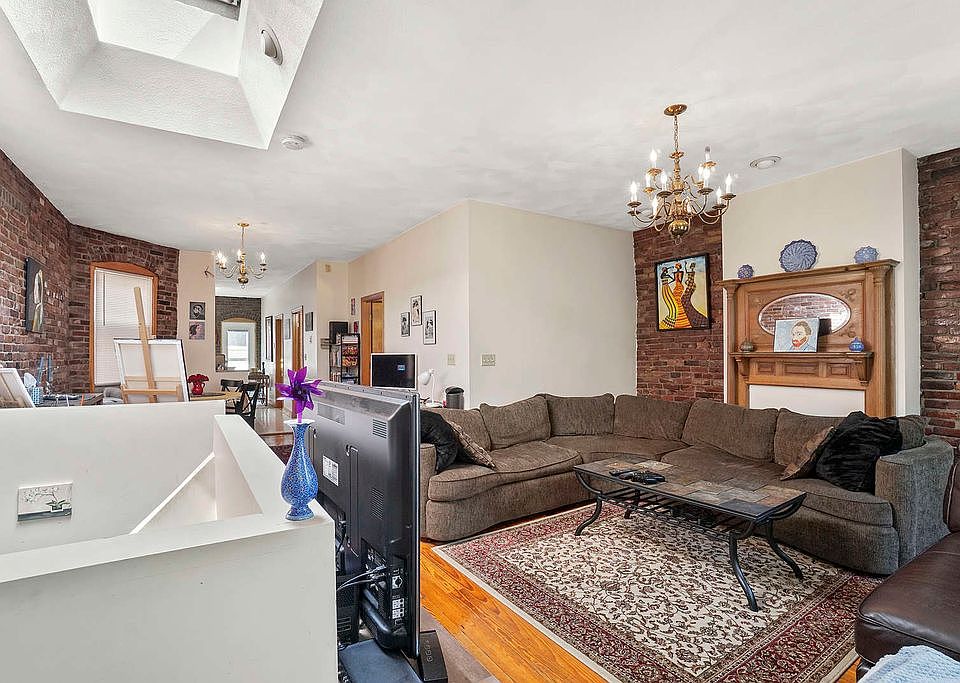 Boston Character-Exposed Brick in every room-Hardwood floors, 9 foot ceilings, Tile K&B, 135 YR old building renovation, top floor of 3 family, with City Skyline views, Gran/SS kit-tiled Kitchen-bath-with full tub/shower, D&D. Original Hardwood Floors and Mantle are all restored. 5' Skylight fills living area with light, One bedroom could also be a great office with more living space available in the outer rooms.