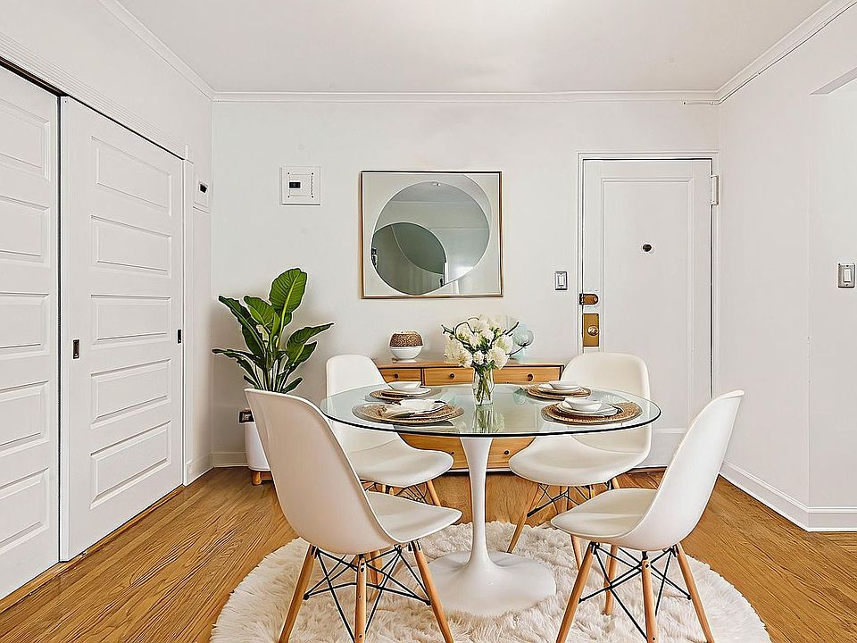 This thoughtfully designed living space combines modern updates with traditional charm. The updated kitchen features contemporary cabinetry, sleek countertops, and quality appliances, while the gleaming hardwood floors add warmth and style throughout. Enjoy the comfort of south-facing views, filling every room with natural light.