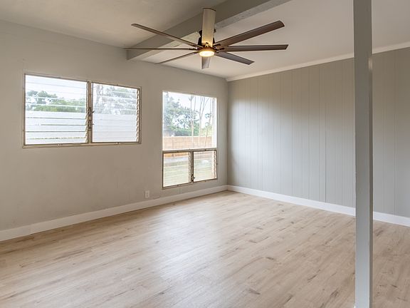 Newly remodeled 3-bedroom, 1-bath unit for rent on the downstairs level of a duplex in Waialua. This unit features new appliances and fans throughout, providing a fresh and comfortable living space. You'll also appreciate the ample parking, outdoor shower, and the unique benefit of being next door to open farms, ensuring no direct neighbors on that side.