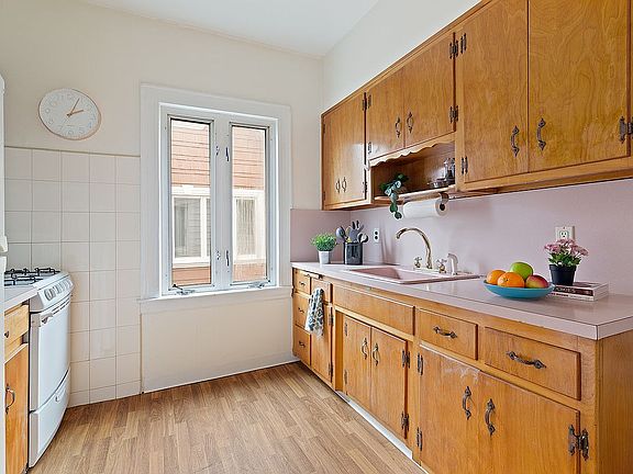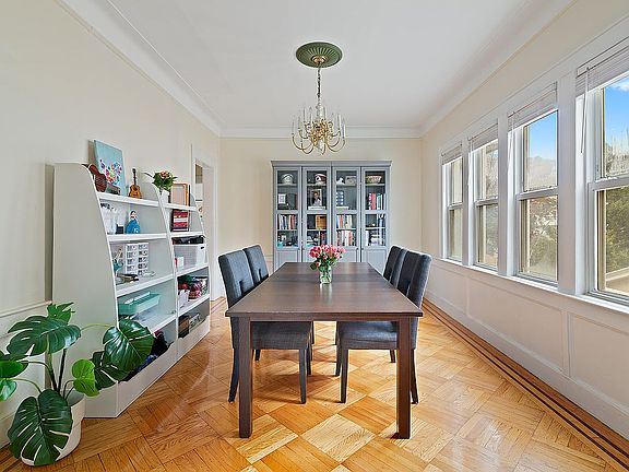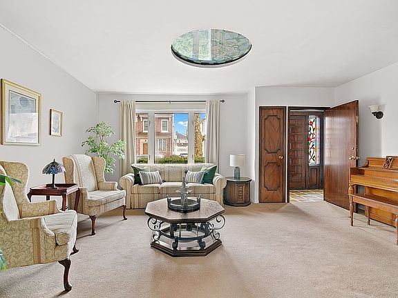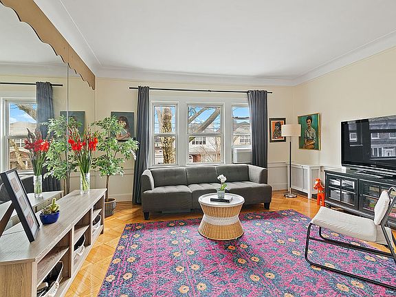 The entryway of the home has separate entrances leading to the owner's duplex and the rental unit. The first floor features a bright and airy South-facing living room filled with natural light and a formal dining room with a beamed ceiling and a wall of windows. This level also has a windowed, eat-in kitchen that features exposed brick, original woodwork, and arched doorways, a full bath with decorative tile and two large bedrooms with plenty of closet space.