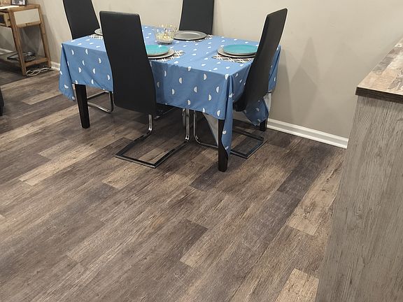 Stacked washer dryer comboStainless steel appliancesHard wood replica floorsSamsung smart appliancesAmple closetsCharm back porch