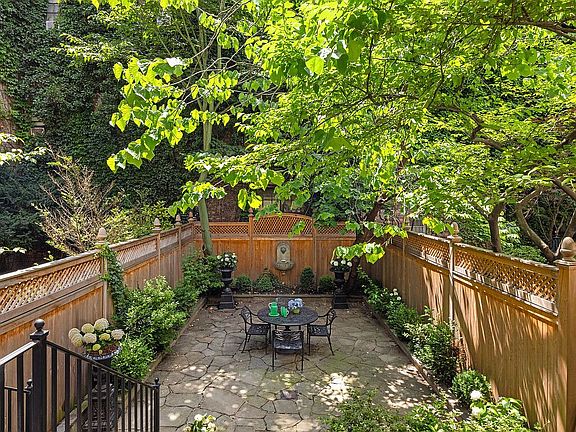 The garden level offers a separate below the stoop entry, a family room with wood burning fireplace, a powder room and an inviting chef's kitchen / dining room with a wall of glass doors giving onto a verdant garden.