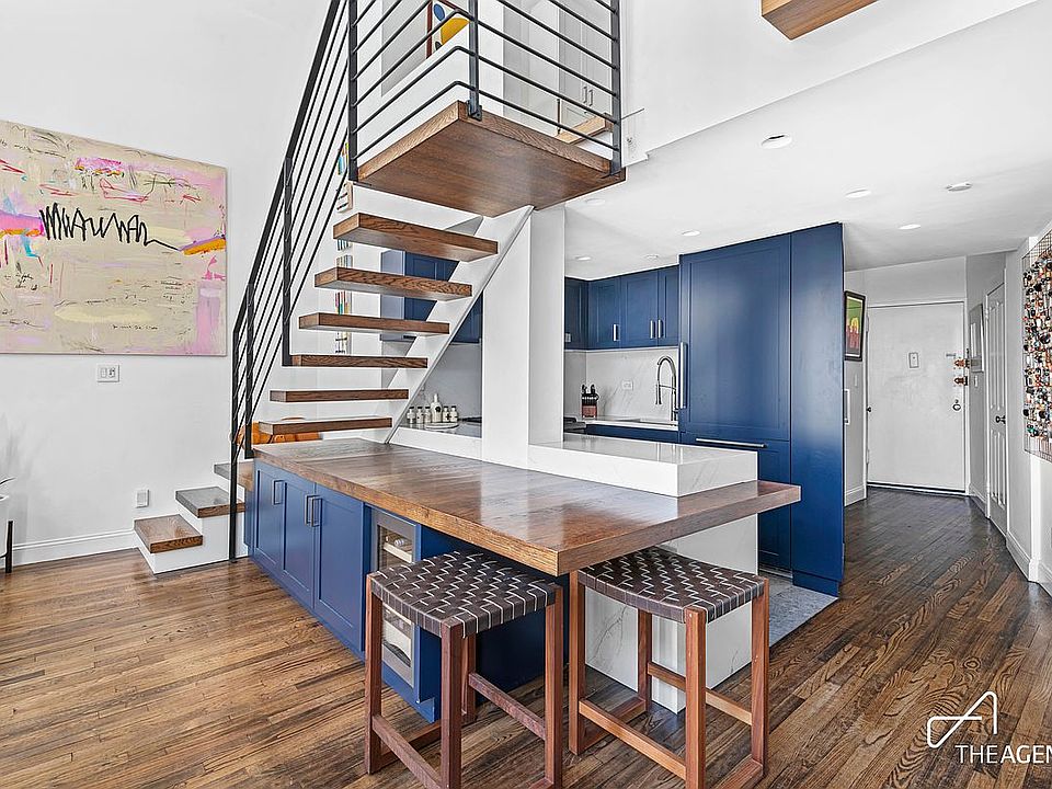 Upon entry, you’re greeted by exposed brick, massive east-facing windows, a striking original Corinthian column, and an elegant floating staircase—all combining to create a sophisticated yet inviting ambiance.