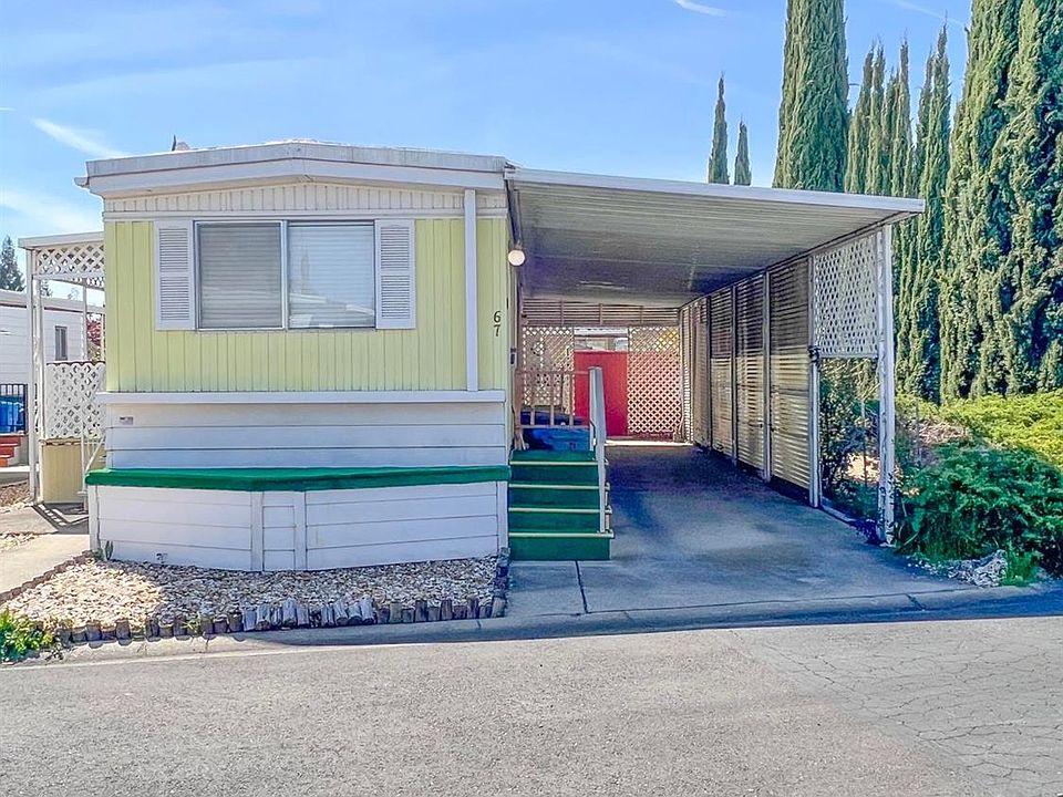 Nice home in the desirable Del Prado 55 + community. The home sits on a corner lot lined with large trees for privacy. Out back there is a storage shed and plenty of room for a small garden. Inside you will find 2 bedrooms, 1 bathroom, inside laundry, and an open concept kitchen/living room combo. With a little TLC this space will be lovely.