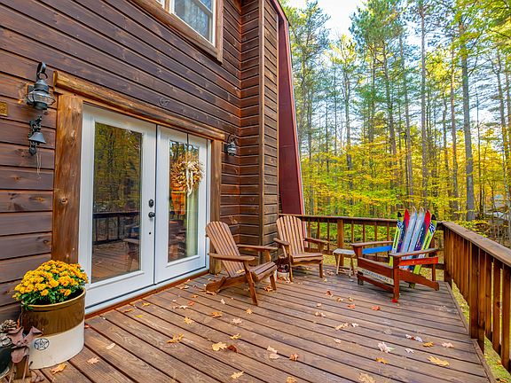 Nestled in the Au Sable Acres this unique 4 bed/ 2.5 bath Adirondack home offers twice the sleeping space of a traditional A frame along with the benefit of a low maintenance, pitched roof like a traditional A frame. As you enter the home you are welcomed with the perfect mixture of rustic yet modern stylings that continue throughout the home. The living room/fireside room is a perfect place to relax by the fire on a cold winter's day. The newly updated kitchen comes complete with stainless steel appliances and eat in island seating. The back deck is located just off the kitchen which is perfect for grilling in the warmer months. The 2nd floor features 3 bedrooms and 1 bath all with hardwood flooring throughout and wood beams ceilings above. You can enter the lower level directly from the first floor or from the walk out access to the back yard. This newly finished space features a large primary bedroom, complete with an office space, bathroom and laundry room. Short drive to Whiteface Mountain, Lake Placid and Hiking in the High Peaks. Optional $75/year HOA fee provides access to Lake Eaton, Hiking, X-County Ski Trails and access to the Ausable River for fishing.
