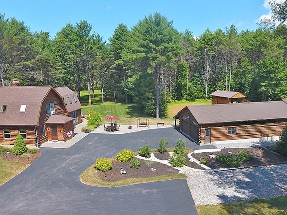 Post and beam log home on 2.5 acres! Beautifully landscaped and meticulously kept will be the first thing you notice as you pull in the paved driveway. And the charm continues as you enter this impeccable and lovingly maintained home. Full D-log open-concept home built in 1988 with 3BR/2BA, post and beam construction, brick Dutch oven, granite kitchen, stainless appliances, family room addition, spacious bedrooms, and newer high-efficiency boiler. Plus a 4 car garage, 28'x36' barn, 14'x24' pole barn, and generator hookup. Outbuildings are perfect for the family with a LOT of toys, car/boat storage, or home business/contractor. Snowmobile or ATV right out your back door to the club trails. A great property for all seasons!