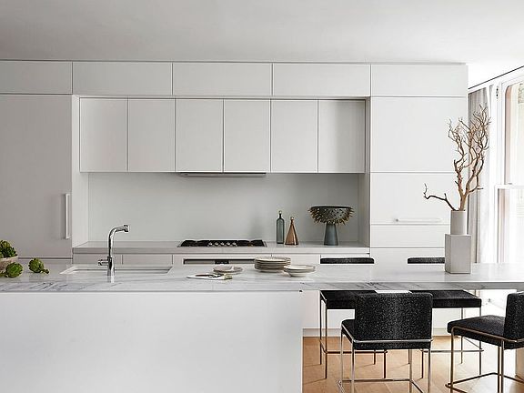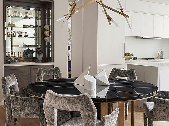 Every detail has been thoughtfully curated, from the seamless integration of the kitchen into the living area with continuity and effortless flow. The custom-designed kitchen is a statement in sophistication, featuring matte lacquer white cabinetry, striking Bianco Oro marble countertops, high-end Dornbracht fixtures, and state-of-the-art Gaggenau appliances for an airy abode in the heart of the home.