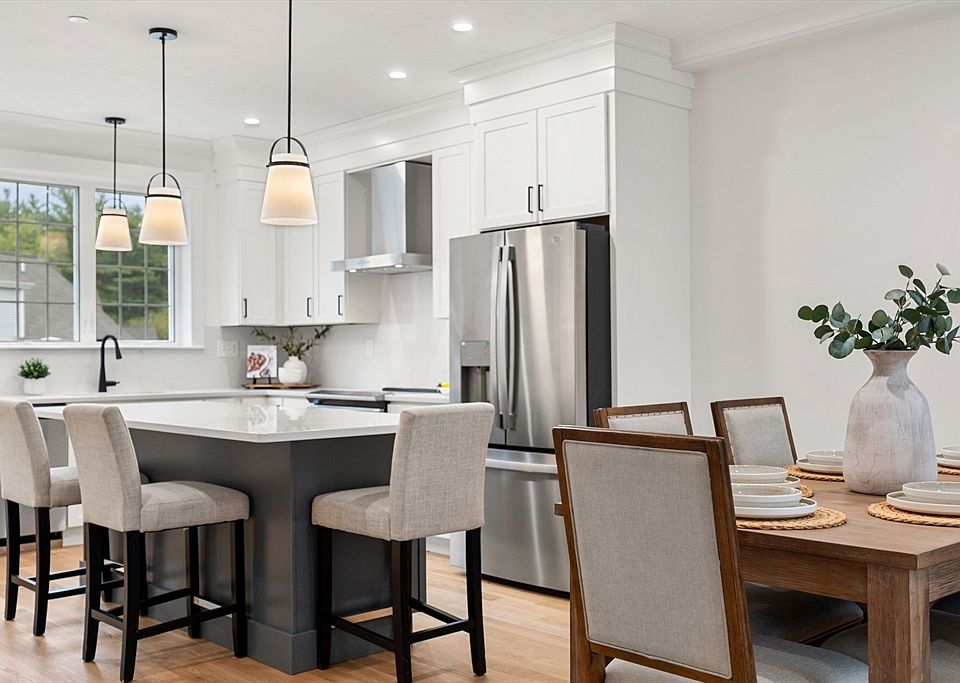 Now offering 4.5% preferred builder financing for the first year on a full price offer. Distinctive Barndominium Townhome on the Hollis/Nashua Line. Step into a rare blend of history and sophistication in this stunning townhouse expertly reimagined from a landmark red barn into a residence of modern elegance. Offering approximately 2,200 sq ft of finished living space across three levels, this home delivers a unique lifestyle with character, comfort, and craftsmanship at its core. The open-concept main level is an entertainer’s dream, anchored by rich oak hardwood flooring that flows seamlessly through the sun-filled living and dining areas. The gourmet kitchen impresses with sleek quartz countertops, premium finishes, and a large center island perfect for casual meals or gathering with guests. Upstairs, two generously sized bedrooms share a well-appointed full bath and are complemented by a convenient laundry area.