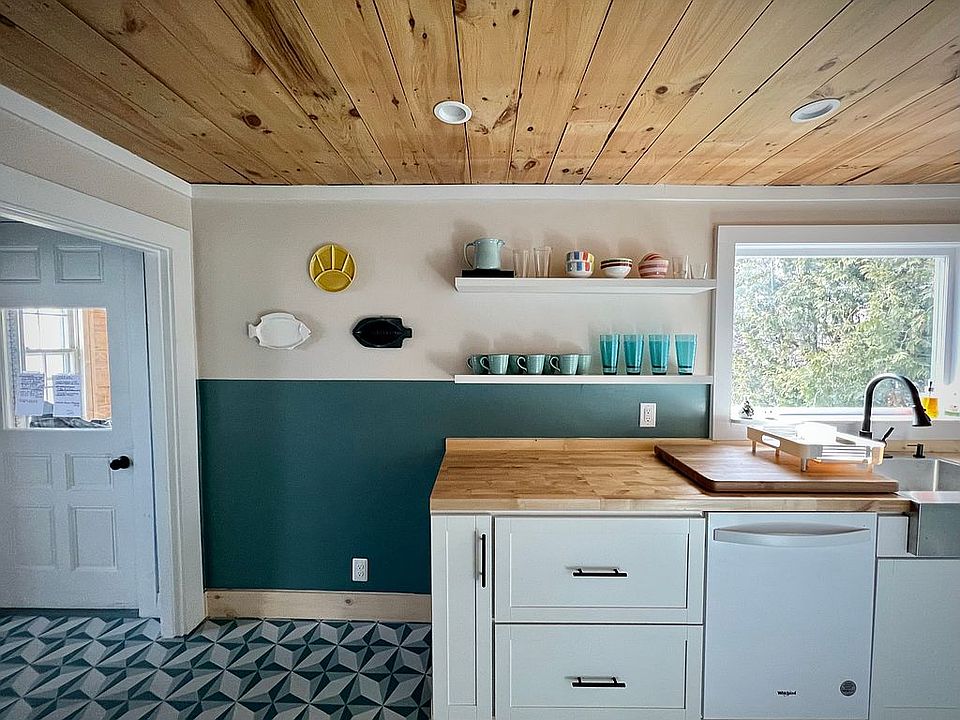 - Updated kitchen with new cabinets and Wallpops flooring; original wood ceiling preserved