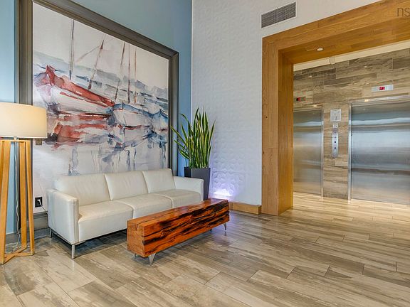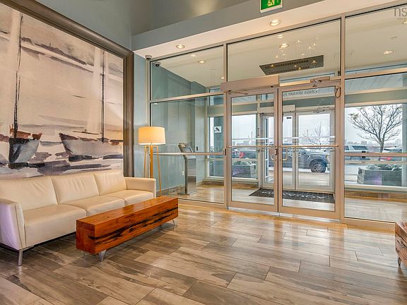 Experience effortless downtown living in this stylish 1-bedroom condo at the Aqua Vista, part of the sought-after Kings Wharf waterfront community. Just steps from the ferry, fine dining, artisan coffee, and the boardwalk, this barrier-free suite blends elevated design with everyday comfort. Floor-to-ceiling windows offer peaceful views of Dartmouth Cove and the gentle glow of sunrise across the water, while engineered hardwood, ceramic tile, and a natural gas fireplace with BBQ hookup add warmth and sophistication. The kitchen is appointed with granite counters, a tiled backsplash, and six premium appliances—including a gas cooktop. The bathroom is thoughtfully designed with accessibility in mind, featuring a walk-in shower with no threshold for ease and comfort. Enjoy resort-style amenities: heated pool, hot tub, fitness and yoga studio, social room with full kitchen, and live-in superintendent. Condo fees include heat, water, natural gas, indoor parking (Space #11), and storage. Welcome to Kings Wharf—where luxury meets lifestyle, and every day feels like a getaway.