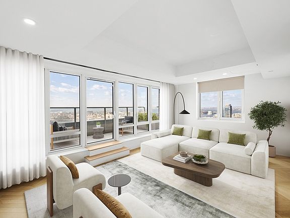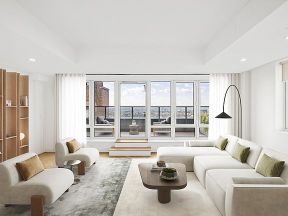 The Penthouse is a flawless floor-through home graced with luxurious finishes, a thoughtful layout and jaw-dropping NYC Skyline and water views. This beautiful 4 bedroom, 3.5 bathroom home is ideal for families and entertainers alike. A private, keyed elevator opens directly into this homes functional entryway foyer and flows into a spacious, open-concept living room, dining room, and kitchen. The apartment spans approximately 2,938 sq. ft. and features a private 465 sq. ft. terrace, beautiful herringbone white oak floors, LED down-lighting, in-unit washer/dryer, and radiant heated flooring in all bathrooms. The spacious living and dining area is nearly 30 feet wide and features a wall of floor-to-ceiling windows that open effortlessly onto the incredibly large balcony overlooking lush gardens below.