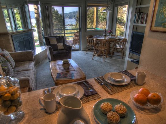 Ground floor 2 bedrm, 1 bath marine view Eastsound Landmark Inn condo unit #5 with recent kitchen & bathroom upgrades, new floors, paint & window coverings throughout. Across from a waterfront park/beach. Near village shopping, restaurants, parks, schools. Enjoy your private deck with sunny views down East Sound. Professionally managed & available for the owner to use from 5/1-9/31 for $50/night and 10/1-4/30 for $6/night including cleaning fee & laundry service. Rental occupancy of 4.