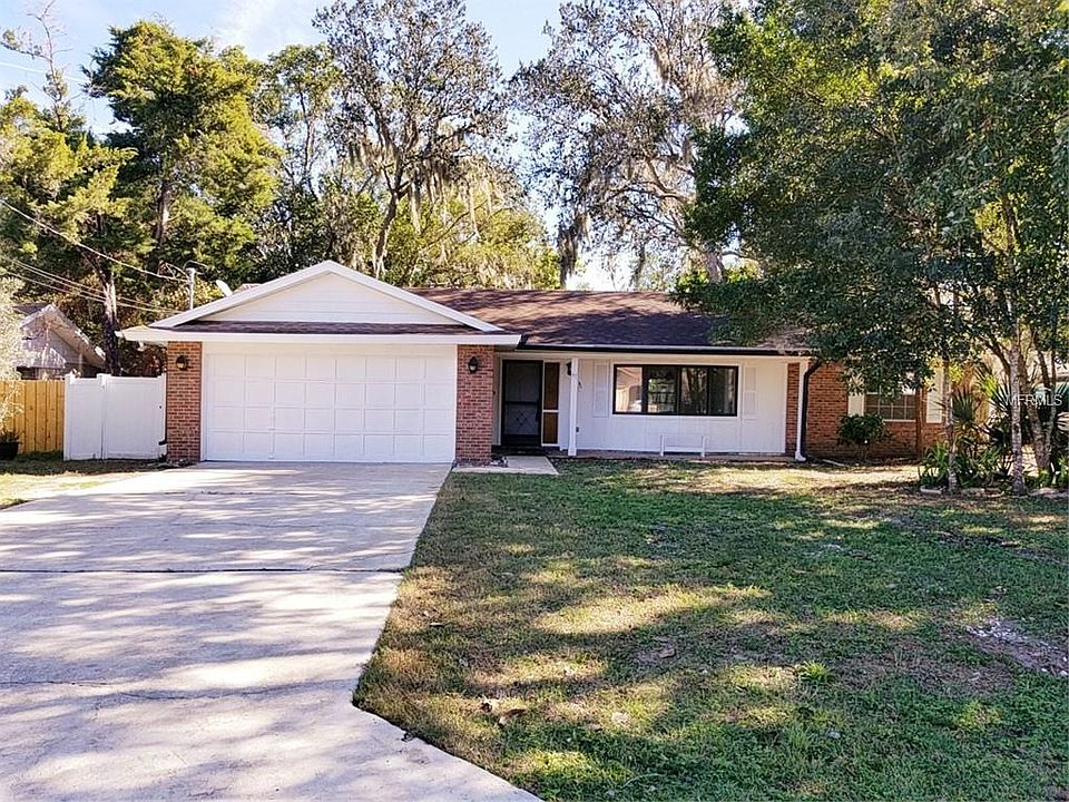 3/2 model home. Vaulted Ceiling in Living, dining and kitchen.Large Master Bedroom, separate dining room, inside utility, 2 car attached garage, large rear screen porch. Mature trees, storage shed in large back yard. Back yard is fenced. Interior and exterior freshly painted. Move in ready.