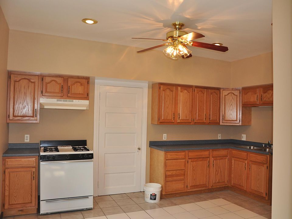 - Large eat-kitchen with oak cabinetry, tile floor, stove and refrigerator and extra large pantry