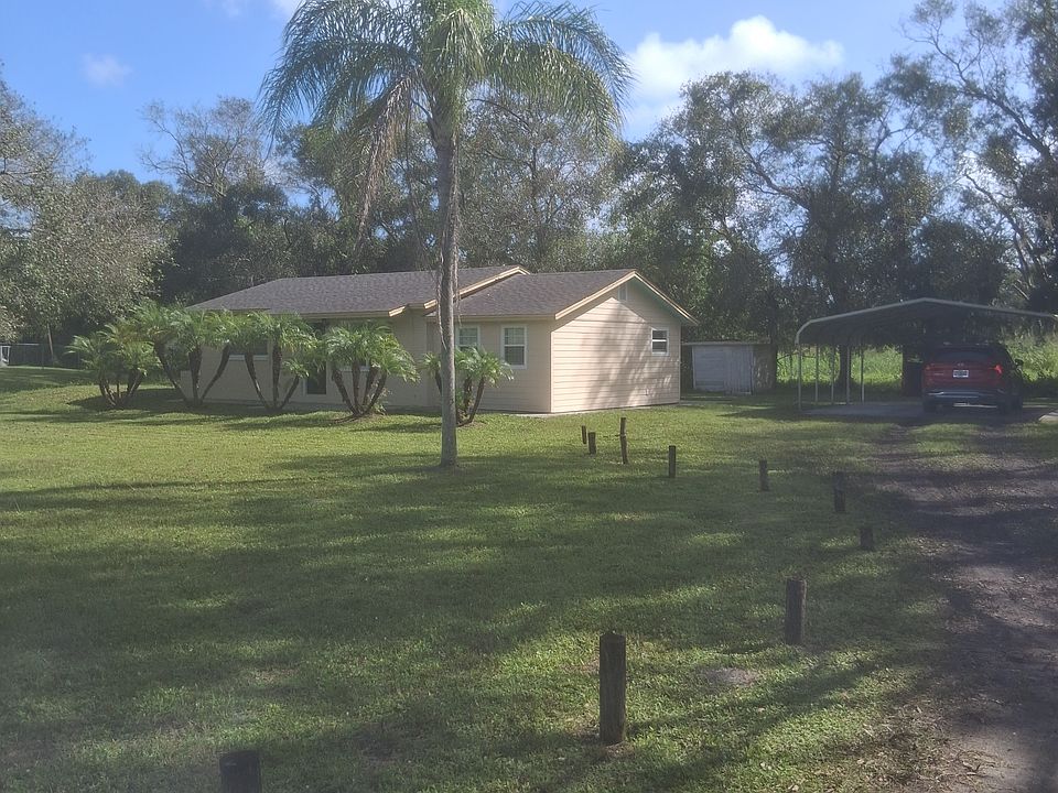 Rent includes lawn service ,pest control ,trash collection. Very clean and freshly painted single family concrete block home available now. 984 sq ft living area. Oversized Lot. Two car Car Port + Shed. Central Air Conditioning, Hurricane Shutters. New roof. Move in ready for 12 month lease.
