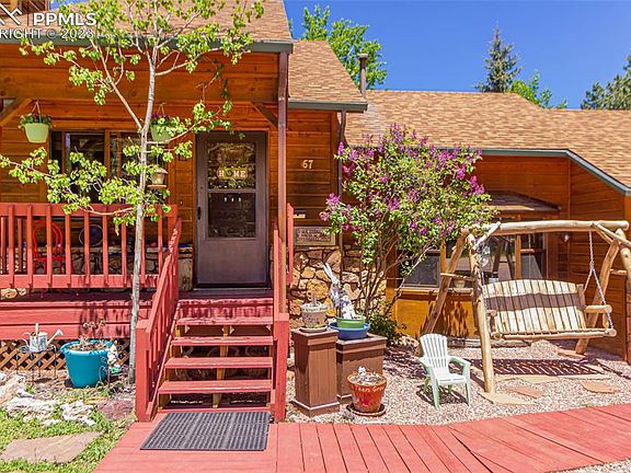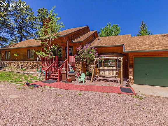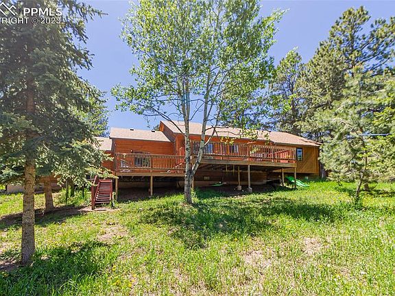 Updated ranch-style mountain home on premium ½-acre lot in quiet cul-de-sac. Just minutes to Woodland Park, this open floor plan, one-level home features a comfortable Great Room with vaulted ceilings, wood stove, and wood laminate flooring. Spacious Dining area and Kitchen with plentiful counterspace and cabinetry. Large Family Room with bay window, just a few steps down from Kitchen. Primary Bedroom has adjoining ¾ Bath and 2 closets. Secondary bedrooms are conveniently located across the hall. Home has been renovated to include new interior paint and vinyl flooring 2022, interior painted 2022, new carpet 2021, and new furnace and air duct cleaned 2022. All window blinds included. Tranquil outdoor living space with beautiful aspens, pines, spruce, and southern exposure! Multi-level 600 sq ft deck provides a great perch to stargaze, entertain, or watch wildlife. Backyard is fenced, driveway graded and graveled 2021, gutter covers added, and barn-style storage shed and firewood included. Westwood Lakes hosts an annual picnic, residents enjoy access to the community fishing pond and National Forest trails, and STR are allowed. Conveniently located near Hwy 24, the hospital, Charis, shopping, hiking, riding, and more. Schedule a visit! You’ll fall in love with this cozy and comfortable home!