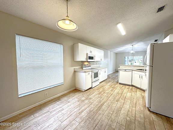 Wonderful location centered between the heart of Palm Bay and downtown Melbourne. Nearly endless amenities within a 5 mile radius. Concrete block with vaulted ceilings. 3 bed, 2 bath split plan has a formal living and dining area to greet you. Open ceiling to eat-in kitchen and family room. Indoor laundry. Spacious primary bedroom with huge walk-in closet, soaking tub, walk-in shower. Wood look tile throughout for easy maintenance. Large 2 car garage and garage door opener. Sliders to back yard with peaceful view of the water and beautiful shade trees. Lawn care included. Pets may be considered on a case by case basis with non-refundable pet fee. No smoking of any kind on the property please. Community Gazebo and dock are available for use in this peaceful community with sidewalks and a conservation area for nesting eagles.