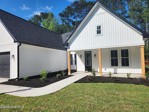 Modern farm house style new construction custom designed home with 3 bedrooms, 2 baths, and a office/flex room located in Carolina Shores North. When entering the home you are welcomed by the foyer with built in cubbies. Located off of the foyer there is a flex room/office in the front of the home. Large living area which features wooden beams in the ceiling and extra windows for more natural light. The kitchen offers quartz countertops, farm sink, oversized island, and stainless appliances, including, dishwasher, microwave, and range. The all-wood cabinetry comes with easy close doors and drawers. There is a pantry in the kitchen then the hall leads to the oversized laundry room that features built in cabinets and quartz top. The dining area is beautifully finished with wainscotting and crown molding in the trey ceiling. The living area has custom wooden beams in the ceiling with ample room for entertaining and opens to a huge covered back porch. The master bedroom offers a trey ceiling with crown molding and a large walk-in closet. The master bath comes with dual vanities, quartz countertops, and custom tile shower. Master closet has built-in wood shelving. This home has 9' walls with 6' windows, not the standard 8' walls with 5' windows. The home features an oversized 8'x18' garage door, along with gutters. The hot water heater is located inside the oversized garage with extra room for storage.