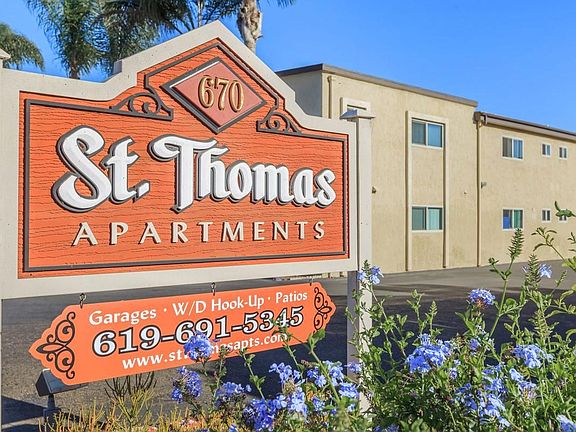 Welcome home to St. Thomas Apartment Homes located in beautiful Chula Vista, California. We offer a smaller community for a more personalized living experience. You will find us just off the I-5 for a smooth commute anywhere you want to be. Our community offers a two bedroom apartment home featuring plush carpeting, an all electric gourmet kitchen with a pantry, ceiling fans, spacious walk in closets and washer/dryer connections. Residents enjoy our easy access to public transportation, assigned parking, detached garages, and picnic area with barbecues. Tour our photo gallery or call us to schedule your personal tour and let us show you why living at St. Thomas is the perfect place to call home.