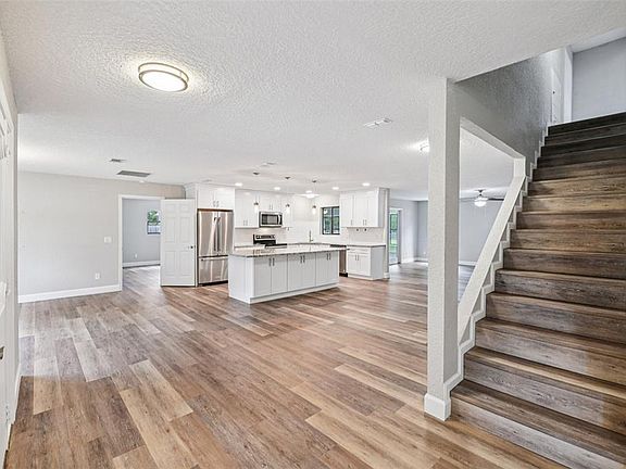 One or more photo(s) has been virtually staged. Nestled on 2.5 treed acres at the end of a private road, this stunning 3,000+ sq ft residence offers a unique blend of seclusion and convenience. The property features a private pond and two versatile outbuildings, creating a true sanctuary. Step inside and discover a welcoming, open-concept floor plan that has been completely transformed. Luxury vinyl plank flooring flows seamlessly throughout the main level, complemented by a fresh coat of paint that brightens every room. The kitchen features white shaker cabinets, SS appliances, granite countertops, and a massive island—the perfect spot for gathering. This home offers both a formal and casual living room, providing ample space for entertaining or relaxing. The main-floor primary suite is a true escape, featuring a beautifully remodeled ensuite with a tiled walk-in shower, dual vanity, and a spacious walk-in closet. Two additional bedrooms on the main level each have their own upgraded bathrooms. Upstairs, the fourth bedroom is a private haven with vaulted ceilings, a cozy sitting room, and a balcony overlooking the serene pond. Located in beautiful New Smyrna Beach, you'll have easy access to shopping, dining, and outdoor recreation, including being just a short drive to the beach or Orlando. This is your chance to own a fully remodeled, contemporary in a peaceful setting yet still convenient to everything you need. Schedule your tour today!