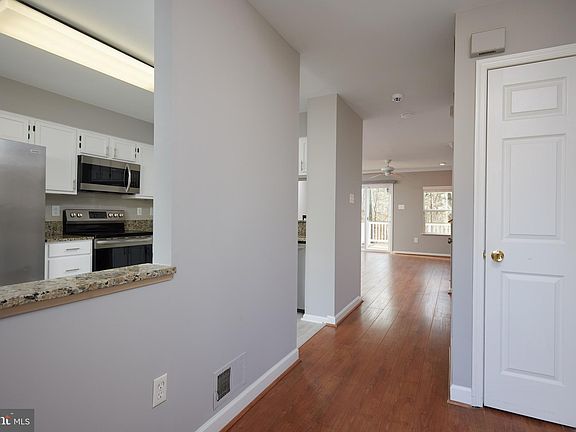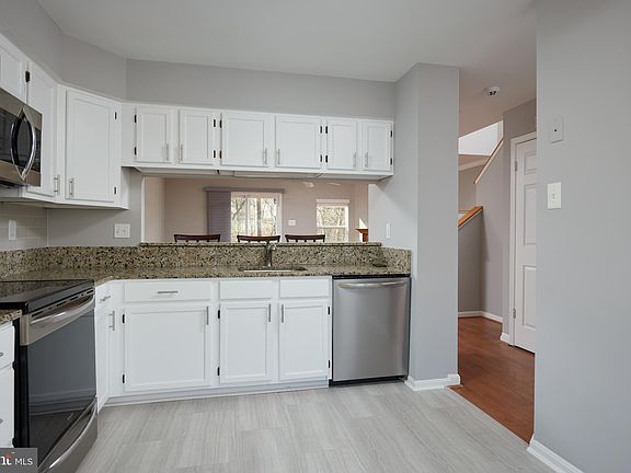Beautifully updated two primary suite townhouse located in Lions Gate! The table-space kitchen features stainless appliances, granite countertops, tons of cabinets and brand-new flooring. The large combination living/dining area boasts a wood-burning fireplace, large sliding glass door to the deck and a pass-through to the kitchen for easy entertaining. The living room flows to the deck with a beautiful, wooded view! The sun-filled primary bedroom has tons of closet space and an en-suite bathroom. The equally large second bedroom has en-suite access to the upstairs hall bath. The basement features an oversized family room with tons of recessed lighting and full third bathroom. Architectural shingle roof is BRAND NEW, and heat pump is 3 years old. This is a great starter home!