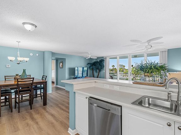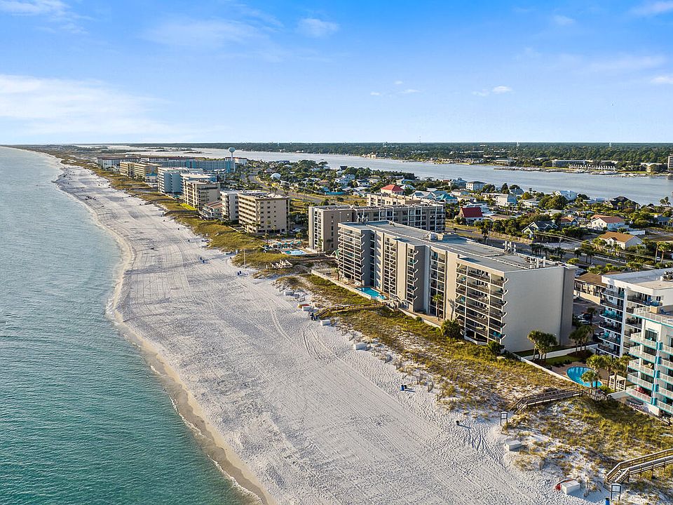 Experience Gulf-front living in this beautifully updated 2-bedroom, 2-bath condominium located in a gated building with only 20 units and a recently completed exterior renovation. The spacious, open-concept living area is filled with natural light and opens to a private balcony. Luxury vinyl plank flooring extends throughout the living areas and bedrooms, adding to the coastal appeal. The well-appointed kitchen features updated stainless steel appliances and ample counter space for cooking and entertaining. A split-bedroom layout provides privacy, with each bedroom offering its own en-suite bath. Additional conveniences include a full-size washer and dryer, walk-in closet, and two owner's closets for extra storage. Dune Pointe residents enjoy a heated community pool, private beach access, and an outdoor shower station. With a strong rental history and prime Gulf location, this property is ideal as an investment, vacation getaway, or year-round home by the beach.