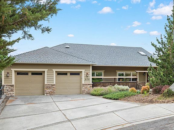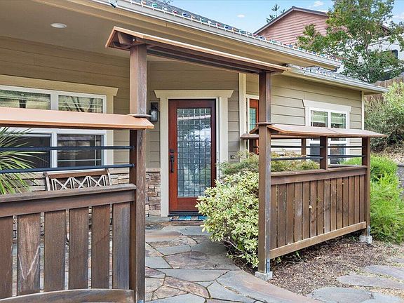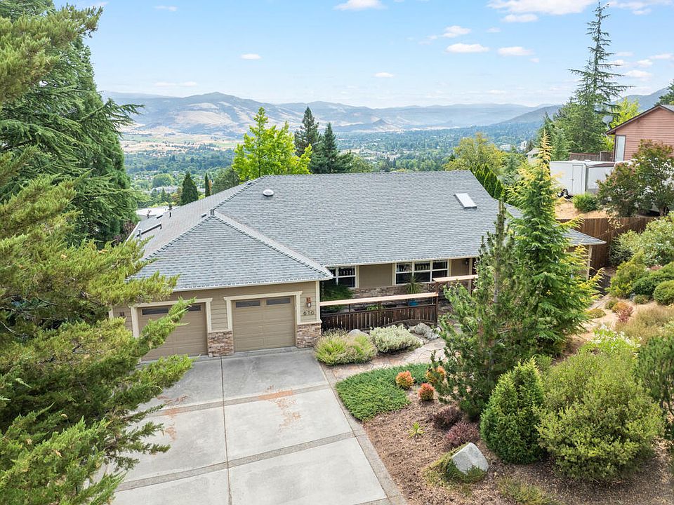 Discover your sanctuary in this light-filled single-level view home above Ashland's Boulevard. Entering through the Japanese garden, your eyes are immediately drawn to the breathtaking sunrise and mountain views from the open living area. Elegant oak hardwood floors flow seamlessly throughout the home, while soaring cathedral ceilings create a sense of space. The well-designed open kitchen has double Thermador ovens, a pro-style six-burner range and hood, island with prep sink, breakfast bar and two lighted pantries. The spacious primary suite boasts a luxurious bathroom with dual sinks, large tiled shower, walk-in closet and built-in vanity. A cozy den offers a quiet retreat for reading or media. The large deck off the living area and multiple garden 'rooms' beckon you outside. A large storage room below offers ample space for your belongings. This home combines beauty, functionality, and comfort in one serene, sunlit space.