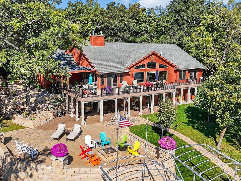 Luxury Lakefront Retreat on Lake Panorama’s West Side nestled on a 1.3-acre wooded lot, this stunning property offers 262 feet of waterfront with breathtaking panoramic views. As you step through the front door, your eyes are drawn to the spectacular lake views framed by a soaring wall of windows. The great room boasts vaulted ceilings, hardwood floors, & a stone gas fireplace. The gourmet kitchen features rich wood cabinetry, quartz countertops, stainless steel appliances, a copper sink, island seating, and an adjacent dining area. The primary suite offers lake views, deck access, & spa-inspired ensuite with a walk-in shower, double vanity, private toilet room, & spacious walk-in closet. The main floor also includes: a guest bedroom with deck access, office with custom built-ins, a sunroom, hall bath, & a mudroom with laundry. The walkout lower level is ideal for entertaining, complete with a wet bar, wood-burning stove, family room, 2 bedrooms, & 3/4 bath, plus a non-conforming bedroom with full bath. Outdoor Living Paradise designed to maximize outdoor enjoyment, features multiple gathering spaces. Expansive upper deck with covered area, covered lower patio with wood-burning fireplace, open patio with firepit, & Tiki bar. At the water’s edge, a private beach plus 3 dock areas: one permanent dock with a slide, one for boats, & one for jet skis (lifts included). This rare property combines luxury living & unmatched lakefront amenities, truly a must-see to appreciate!