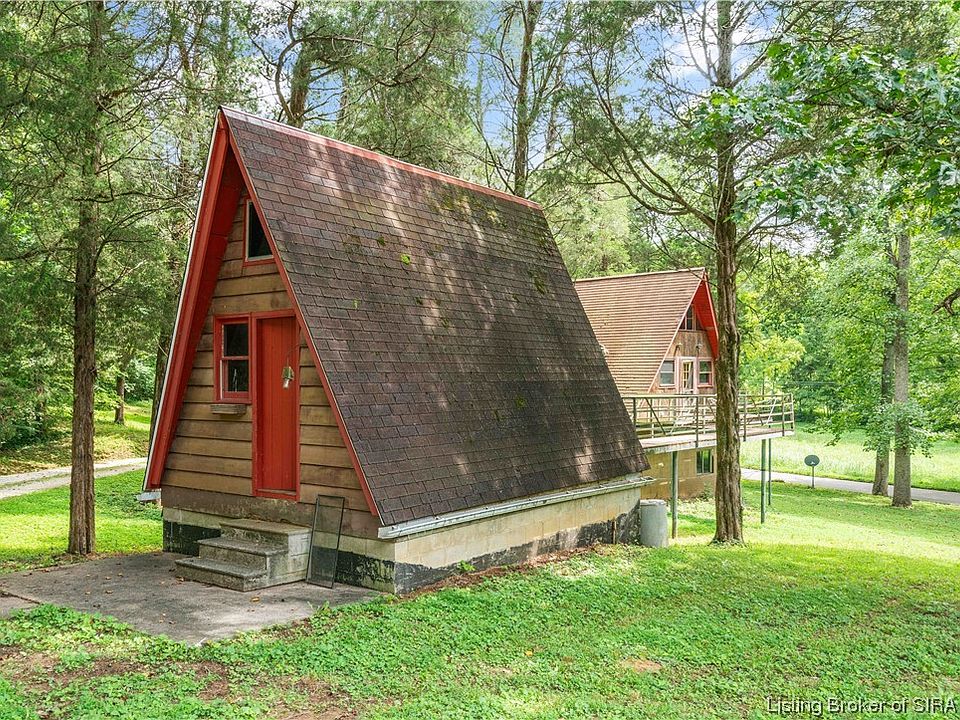 Are you looking for the perfect retreat, mini farm or permanent residence? Look no further than this unique A-Frame home on 7+/- wooded acres. The top floor of the A frame is light filled inside and provides a balcony for enjoying the outdoors. This property offers plenty of room to grow, from the large steel frame shop (big enough for an RV), chicken coop, plus attached main floor garage this property features options for everyone! Additional home site provides extra possibilities with room for a guest house. Endless options to make this property your own. The wooded lot offers plenty of natural shade in addition to providing privacy and seclusion. All of this nearby Blue River (Rothrock Mill access point) and 100's of acres of Hoosier National Forest creates a beautiful place to relax. The acreage is also large enough for a garden and other outdoor activity. Whether you are looking for a place to relax or a mini farm, this property is an ideal choice and ready for you to make your own!