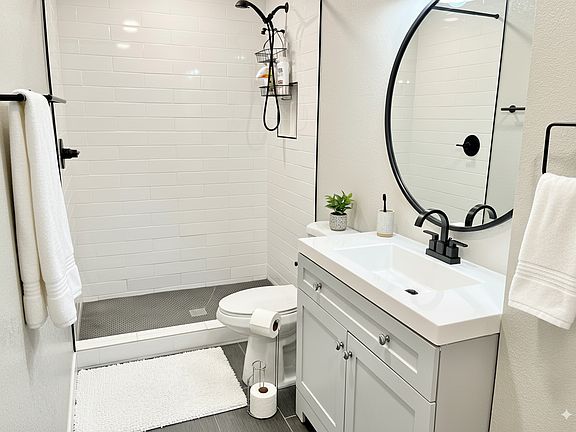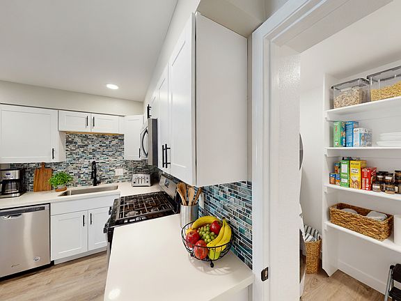 Gas stoveNew cabinetryQuartz countertopsLaundry roomLaminate flooringStainless steel appliancesTiled standalone shower