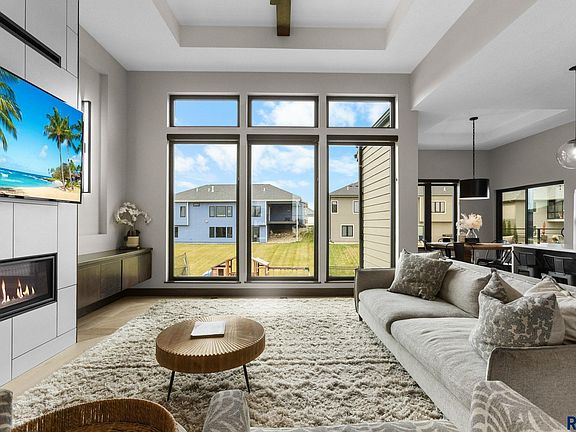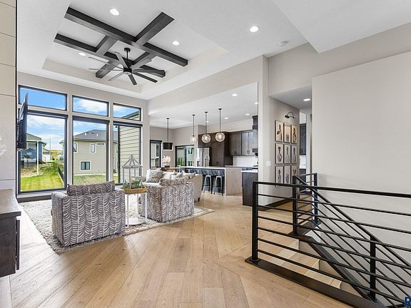 Welcome to this stunning, luxe home located in a quiet cul-de-sac in Mystic Heights—just steps from Fred Assam Elementary and within the top-rated Brandon School District. This walk-out ranch-style home blends everyday comfort with upscale style, offering designer finishes, smart layout choices, and exceptional attention to detail throughout. From the moment you walk in, you’re greeted by soaring coffered ceilings in the oversized living room with ultra sleek fireplace, motorized blinds, and a seamless open-concept design. The chef’s kitchen impresses with quartz countertops, custom birch cabinetry, gorgeous tiled backsplash, a large center island, and an oversized delightful hidden walk-in pantry. The main level features three generous bedrooms, including a luxe primary suite with heated bathroom floors, a walk-in tiled shower with two shower heads, dual vanities, heated floors and a spacious walk-in closet with custom shelving. The main-floor laundry offers built-in drying racks and storage, while the smartly built-out drop zone helps keep everything in its place. Head downstairs to a fully finished walk-out lower level designed for entertaining. Enjoy a spacious living room with a second fireplace, full wet bar, game area, and cozy breakfast nook. The lower-level bathroom includes heated floors for year-round comfort. A versatile flex room offers the perfect flex space for a rec room, office, playroom, or home gym—an ideal extra rarely found at this level. Step outside to a huge backyard featuring an oversized stamped concrete patio, a covered deck, and your very own spacious basketball/pickleball court—perfect for tournaments or playdates. Permanent holiday lighting is already installed, adding effortless charm throughout the year. The oversized, heated, and fully finished garage is insulated and smartly designed for storage, hobbies, and real-life convenience. Throughout the home, you'll find customized closet systems and built-in shelving, elevating both function and flow. This home offers luxury, functionality, and unbeatable location in one of Sioux Falls’ most desirable communities.