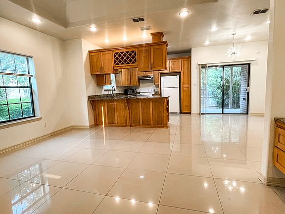 Upon entering you will notice the open concept design, tall ceilings, and tile flooring throughout. The kitchen features a large granite breakfast bar, lots of cabinet storage and built-in wine storage. Off the kitchen is a large area for a dining table, a coffee bar with more storage, and a walk out to the fenced backyard.