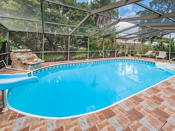NEW ROOF!!! Welcome home to this beautifully updated 2 bedroom, 3 bath pool home with attached 2 car garage. This property is surrounded by amazing tropical landscaping. Beautiful built-ins in the formal dining room area are perfect for extra storage. The kitchen is gorgeous with updated wood cabinets, granite countertops, tile backsplash, tile floors, breakfast bar, stainless steel appliances and sky lights keep the area feeling light & bright. A fireplace in the family room area is perfect for the chilly Florida evenings. The bedrooms are spacious with the master having an nicely updated ensuite bath with tub/shower, dual sinks, granite countertops. There is a bonus area that would work for a third bedroom. The pavered pool area and screened-in lanai are perfect for entertaining. Updates include A/C (3 years), flat roof (5 years w/lifetime warranty) pool liner (1 year), new windows. There are solar panels to heat the saltwater pool. Excellent location near downtown New Port Richey with restaurants and night life, City Park pier and the river. Call on this one today... it won't last!