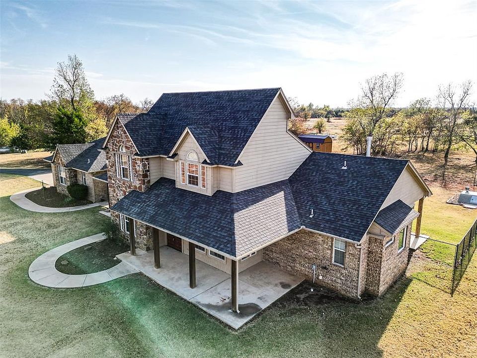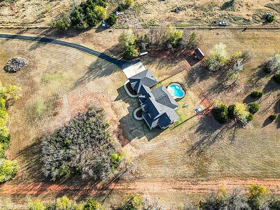 Don't miss out on your opportunity to purchase this beautiful dream home secluded behind trees on 7 acres MOL. This Mustang property is ideal for those seeking both privacy and high-end amenities, including multiple dining areas, a study with built-in shelving and beautiful hardwood-style tile throughout the main floor. The property highlights include a recently renovated master bathroom. Featuring double vanities, a freestanding tub, a full-tile shower and dual walk-in closets. Two fireplaces and a spacious open-concept living area that connects the kitchen and dining spaces. Geothermal heating and cooling systems. Home also has a whole-house generator ensuring continuous power during outages. An upstairs bonus or flex room provides additional versatile space. The property also has a wrap around porch , an in-ground pool, a four-car garage, storm shelter and storage building. Schedule your showing today to see this amazing property!