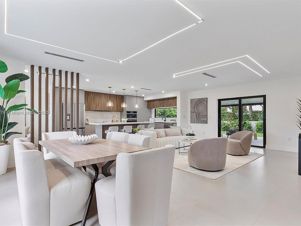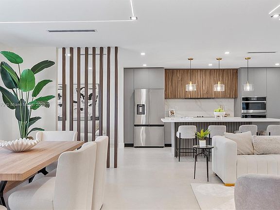 A vision of modern sophistication and effortless Miami living. This 2025 rebuilt turn-key designer home welcomes you with a bright, open-concept layout filled with natural light. New Features include porcelain floors, Calacatta quartz countertops, Italian-style kitchen cabinets with premium appliances and wine fridge, new pavement driveway, new impact doors and windows, and designer lighting. The primary suite offers double sinks and custom floor-to-ceiling closets. Paneled door for the half bath, den or family/TV room, and a spacious green yard with pergola with room for a pool complete the layout. The property sits on a dead-end street. Nearby linear Park/trail in projects. Excellent location, minutes from Coral Gables and major highways. A true modern sanctuary.