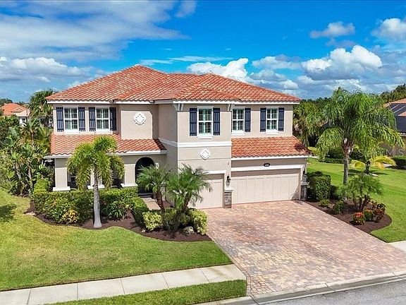 One or more photo(s) has been virtually staged. Exquisite 4,310 sq. ft. lakefront residence, built in 2014 and completely renovated in 2022, offering luxury and comfort within the gated community of Redhawk Reserve. Designed with five spacious bedrooms, four-and-a-half baths, a heated saltwater pool, three-car garage, and classic brick paver driveway. This home is positioned perfectly on a premium waterfront lot. Step inside to soaring 21-foot ceilings and an open, airy layout accented by neutral designer tones, crown molding, custom woodwork, and plantation shutters, blending timeless elegance with modern style. The first floor showcases a thoughtful layout with formal living and dining areas, a guest en-suite, powder bath, laundry room, and ample storage. The gourmet kitchen features Quartz countertops, stainless-steel appliances, a seven-foot island, induction cooktop, stainless-steel range hood, coffee/wine bar, and built-in banquette seating. Abundant cabinetry and workspace make this kitchen both stylish and functional. The family room flows seamlessly to a screened lanai with heated saltwater pool, lush tropical landscaping, and tranquil lake views. The covered outdoor area offers dual ceiling fans and generous space for dining, seating, and lounging. Upstairs, the primary suite serves as a private retreat with two custom walk-in closets and a spa-inspired bath featuring split vanities, a makeup area with marble countertops, freestanding soaking tub, and large walk-in shower. The loft area provides flexible space for a media or game room, while three additional bedrooms, including two en-suites with built-in closets, offer comfort and privacy. The extra-deep three-car garage includes epoxy flooring and overhead storage. A six-zone irrigation system, fed by recycled water, maintains the lush landscaping. Hurricane shutters, a reinforced front door, and a child-safe pool barrier add peace of mind. The home also includes a whole home Culligan water system with softener. Redhawk Reserve features a gated entrance, sidewalks, and scenic lakes. Award-winning Siesta Key Beach and UTC Town Center are only a short drive away. * Top rated school district* This home combines luxury and convenience in one of Sarasota's most desirable communities. Be sure to experience the 3D-Matterport virtual walkthrough. Don't miss this opportunity! Schedule your private showing today!