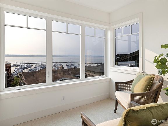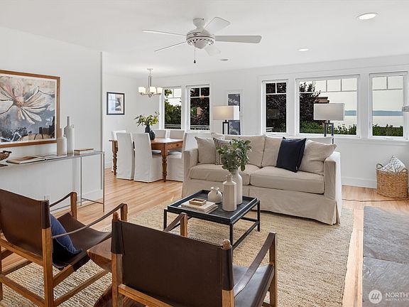 Tucked on a quiet street with a greenbelt to the south and stunning views of Shilshole Bay and the Olympics from the main floor and retreat-like primary, this home blends everyday comfort with coastal magic—a daily reminder of PNW beauty. Updates include refinished hardwoods, new carpet, and fresh interior and exterior paint. The vintage kitchen and bath offer opportunity for sweat equity. The daylight lower level features a family room opening to the backyard, perfect for movie or game night, and easily adapts for long-term guests, hobbies, or a second WFH space. Attached garage plus additional off-street parking. Picolino's Restaraunt and bakery, Portage Bay Cafe, Ballard Locks and Ballard Ave just mins away. Dog Park at Golden Gardens