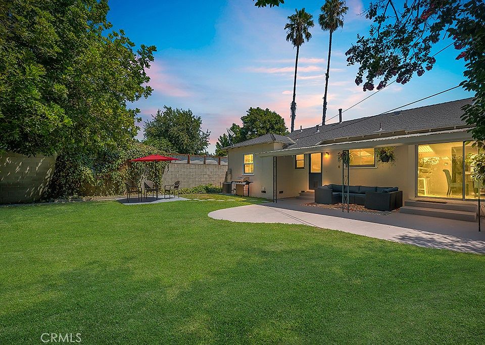 The property's outdoor spaces are equally impressive. Both the front and back patios, along with the driveway, have been newly refinished, creating a welcoming and polished exterior. The large backyard is a tranquil haven, boasting mature landscaping and a variety of seasonal flowers. The patio overhang provides ample shade, making it the perfect spot for sunny days. The front yard offers five fruit trees, including lemon, orange, mandarin, grapefruit, and lime.