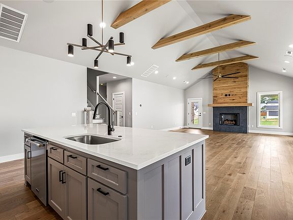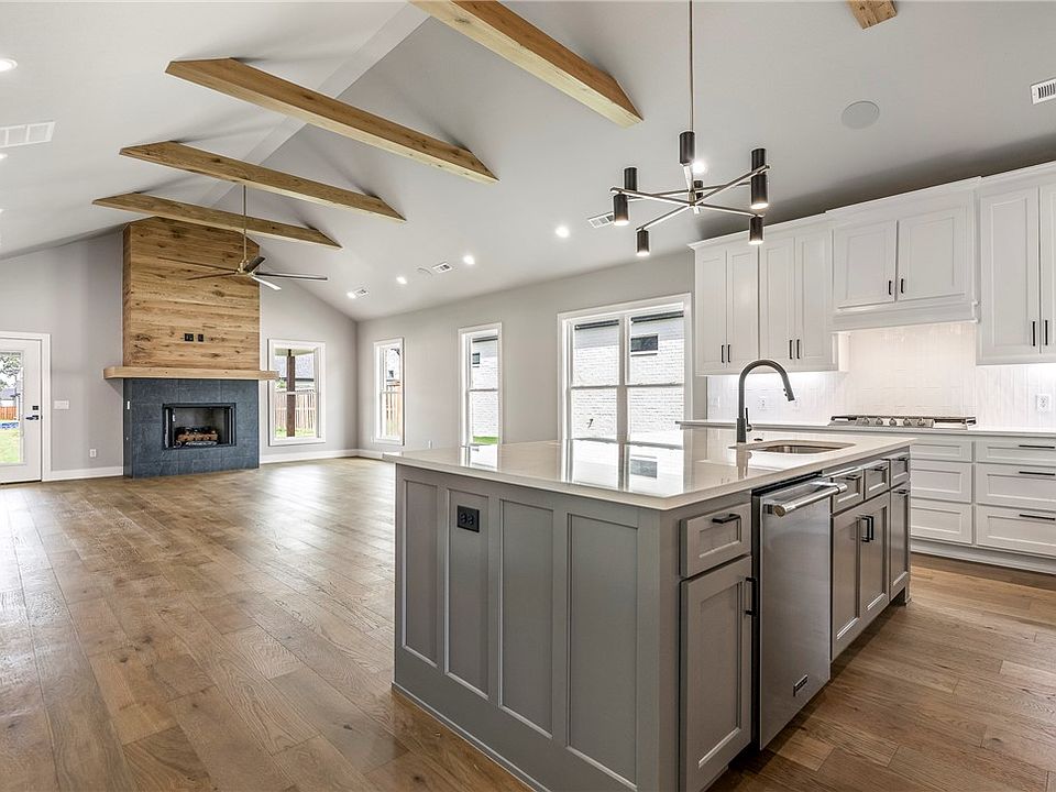 Three car garageStunning rustic beamsBeautiful modern fixturesHardwood floorsQuartz countersCovered back patioCustom cabinets