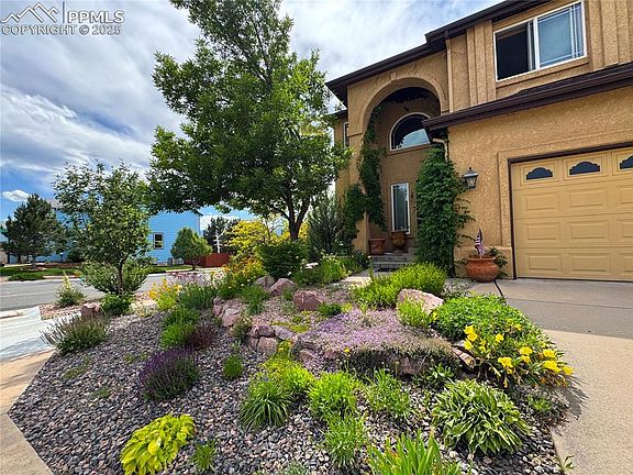 This beautiful Newport Heights West gem blends incredible views, thoughtful updates, and model-home quality finishes. This home has had only one owner and has been lovingly maintained as a smoke-free residence. Perfectly set on a large corner lot with mature landscaping, garden boxes, and a new composite deck, the home offers both privacy and stunning Front Range mountain views—especially from the upstairs primary suite, bath, and loft. The exterior is low-maintenance with stucco siding, a vinyl privacy fence ideal for pets, and high-impact roof shingles. Inside, you’ll find wood-like ceramic tile flooring, fresh interior paint, new carpet, and plenty of natural light throughout, including in the garden-level basement. The spacious floorplan includes formal and informal living spaces, three bedrooms upstairs, and two additional bedrooms in the basement. The basement is perfect for entertaining with a wet bar, mini fridge, and a cozy gas fireplace, complementing the second fireplace upstairs. This former Vantage Homes model comes loaded with upgrades, including a whole-house sound system, walk-in pantry, whole-house humidifier, EV charging in the garage, and newer mechanicals. The backyard is a retreat with a large patio, mature trees, and lush landscaping. Conveniently located near Cottonwood Creek Park, walking paths, shopping, restaurants, and with easy access to both Powers and Academy, this move-in ready home checks every box. Welcome home!