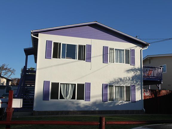 Upstairs unit one block from beach access, balcony, double pane windows, tile kitchen and bathroom, wood flooring in all bedrooms (3). Code locks on all doors. Front and back yards with lawn and fruit trees. Off street parking shared with upper unit. Laundry room at rear of property. Owner pays trash, water, and gardening
