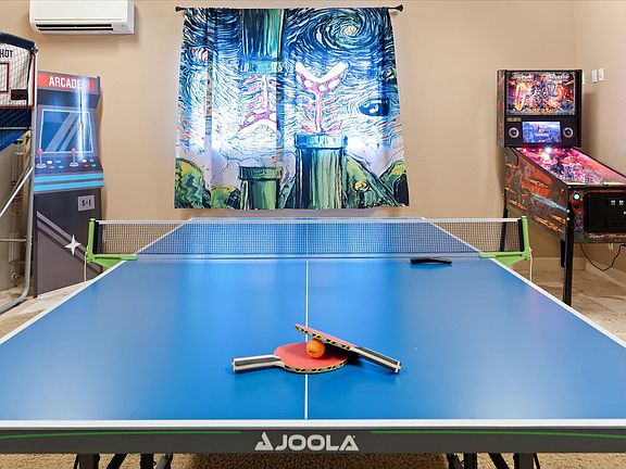 Desert luxury awaits in this spacious retreat, blending modern comfort with Southwestern charm. The bright open floor plan, stylish living areas, and fully equipped kitchen make it ideal for cooking and entertaining. The guest house provides additional privacy, balancing togetherness with relaxation. Enjoy a game room with ping pong, arcade games, and more, or unwind in the living room with a smart TV and indoor fireplace.