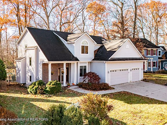 Best of all worlds! Haslett Schools with Bath Township taxes. Approx. 2,326 sq. ft. of finished living space in this 5-bedroom 3 full bath two-story home nestled on a private backdrop lot with a fenced backyard and a 3-car garage! Lovely foyer entry with hardwood flooring throughout much of the main floor. High ceiling heights, crown molding and many great extras. Large kitchen with granite countertops, charming glass door accents, loads of cabinets and countertop space. The informal eating area includes access to the 2022 Trex decking and rear fenced yard. The eating area opens to a beautiful great room anchored by a fireplace. The drop zone opens to a 3-car garage with a first-floor laundry (washer and dryer stays). Main floor guest bedroom/study with easy access to the full bath. 4 nice sized bedrooms on the 2nd floor all with walk- in closets plus one with cathedral ceilings and an arch top window! Compartment bath with a large double sink vanity plus separate shower & stool area. The primary bedroom has backyard views, vaulted ceilings and a private bath with double sinks, whirlpool tub, and a skylight. The lower level is ready to be finished with an egress window and plumbed for a full bath. Irrigation in the front yard, Lena Wicks gas 110 BTU with humidifier/dehumidifier 2022. Maytag washer & dryer 2022. Trex decking 2022. Bosch dishwasher 2022. New Anderson windows 2024. Shades 2025. Enjoy the neighborhood park with play structure, basketball court, and picnic tables. Fabulous offering! Seller reserves: Play structure.