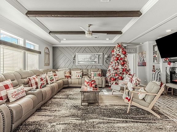 Modern fixturesCozy electric fireplaceCircular drivewayClean landscapeElegant ceiling beamsDedicated vanity areaInviting open-concept layout