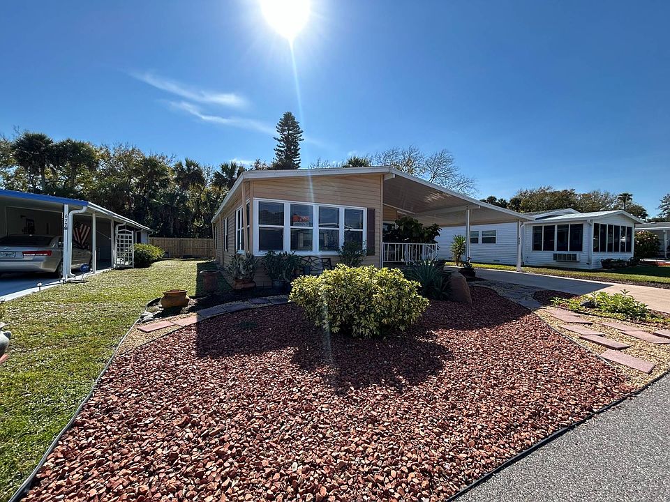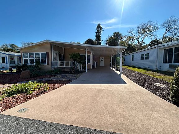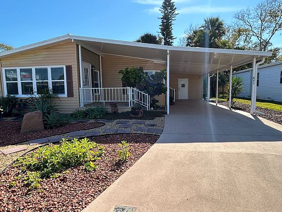 If you Love the Water This spacious & clean two bedroom two bath home in a gated intracoastal waterfront 55+ community with lots of amenities and activities is a must see, It is in walking distance to the fishing pier, boat ramp, & clubhouse. Nice, updated eat in kitchen with lots of cabinet space, all appliances stay including washer and dryer. Living room is very spacious & open. Master bedroom is spacious enough for a king size suite with private bathroom. Second bedroom is great for guests or an office, laminate floors throughout. The all weather Florida room is great for entertaining with lots of windows & natural light. Home sits on a nice lot with a large backyard Great for gardening along with a utility sink. The long driveway and carport can host two cars, very spacious shed for extra storage with a second shed in the backyard. This waterfront community has 3 freshwater Scenic lakes Great for fishing, Two beautiful clubhouses with lots of activities, Two pools, two hot tubs, two saunas, Fitness Center, Pickleball, tennis, basketball, resort style amenities in a tropical ambience. Close to shopping, Restaurants, medical, beaches. Motorcycle and pet friendly. Make this spacious gem & resort living your forever home or winter retreat. The owner is motivated and open for offers. Lot rent is $1,173 and includes basic cable, trash and park amenities. ALL INFORMATION DEEMED ACCURATE BUT NOT GUARANTEED. Additional fees for amenities may apply. Agent and or Company is not responsible for quoting current monthly fees, lot rent, or dues/fees associated with the community or home. Those figures are the responsibility of the buyer and community manager/owner to obtain/ disclose.