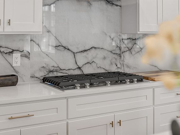 Sleek gas fireplaceTiled showerQuartz countertopsStainless steel appliancesPrimary suiteWaterfall islandSoaking tub