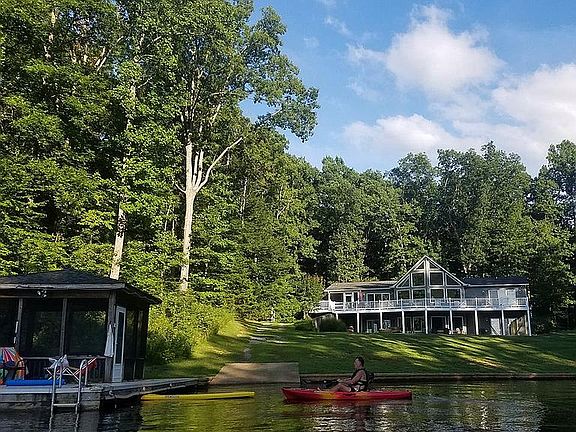 Perfect Lake home with great history of Vacation Rentals through VRBO. Four total bedrooms with 4 1/2 baths, to include two en suite master bedrooms located on main floor, with one en suite master bedroom and a kids room with attached bathroom downstairs, both with great views of the lake. This is a bright open home with the most efficient floor plan for a home with NO wasted space! Home is located in quiet deep water cove with own private boat ramp, just inside dyke 2, at center of the private side of lake. Location is great for watching fireworks!! House is a non-subdivision property on 1.6 acres, with NO HOA fee! Lots of room to build detached garage with size of your choosing. Large window wall greets you as you enter the home so open lake views can be seen immediately upon entry, and from almost every room including both kitchen and dining area! Living room is spacious and has gas fireplace with stone from floor to ceiling. Kitchen is large with plenty of counter space for food preparation, with pantry, and includes under-counter ice maker. Downstairs boasts large gathering area with great views to the lake, gas fireplace again with stone to ceiling, with space for pool table, foosball, and air hockey! Top deck stretches length of home with bump out for Gas Grill with direct propane connection, and includes an enclosed deck patio to fully enjoy the view of the lake while being outside, without needing to be in sun. Downstairs patio also stretches length of home and includes relaxing bench swing, hot tub, and enclosed outdoor shower. A few steps away is a fire pit for enjoyable gatherings and smores with friends. Property is protected at waters edge by stone block sea wall for long lasting durability. Dock includes large sunning area, boat lift with increased lifting capability, covered screen porch area with ceiling fan, and storage room for all your lake toys! Water depth at ladder is approximately 9' and at end of boat house is approximately 14'. We have never had any issue taking our boat out during times of draught! The Yard boasts underground sprinkler system with new pump installed recently in lake so as not to draw on well resources. Home includes recently replaced HVAC units (two), and a new well pump and pressure tank. Rentals scheduled periodically through 8/20/22, but access can be gained by arranging with owner between rentals. Please call owner to schedule a time and date to view property. Seller will pay 2.5% Realtor Commission. Serious inquiries only please.